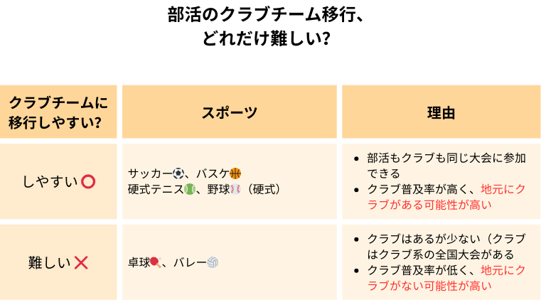 ※ 卓球やバレーなど、クラブチーム文化が浸透していないスポーツもあります。クラブチームに移行するには、スポーツ毎の対応も必要です。